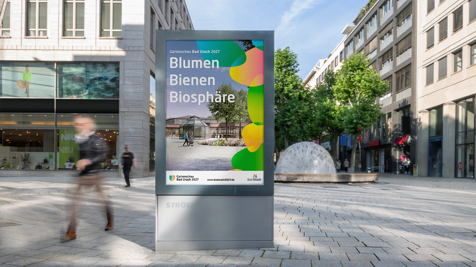 Bereits im Juni 2024 startete ein intensiver Markenworkshop mit Vertreter:innen der Stadt, in dem grundlegende Aspekte der Markenstrategie herausgearbeitet wurden. Daraus entstand ein innovatives Markenkernkonzept und ein konsistentes Corporate Design, das in vielfältigen Anwendungen – von Plakaten, RollUps, Postkarten, Kugelschreibern, T-Shirts und Flyern bis hin zu Gestaltungskonzepten für Bauzäune, Citylights und einem Leitsystem – überzeugend umgesetzt wurde. Designelemente aus dem Erscheinungsbild von Bad Urach, etwa die Schrift und Teile des Farbsystems der Stadt wurden integriert und weiterentwickelt, um einen einheitlichen visuellen Auftritt sicherzustellen.